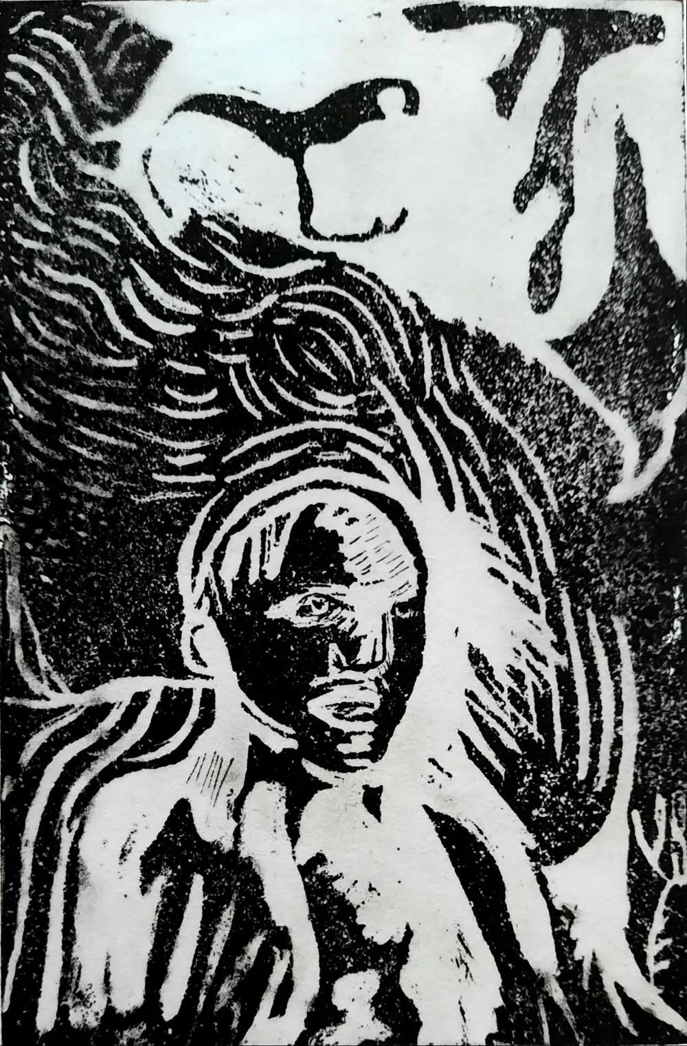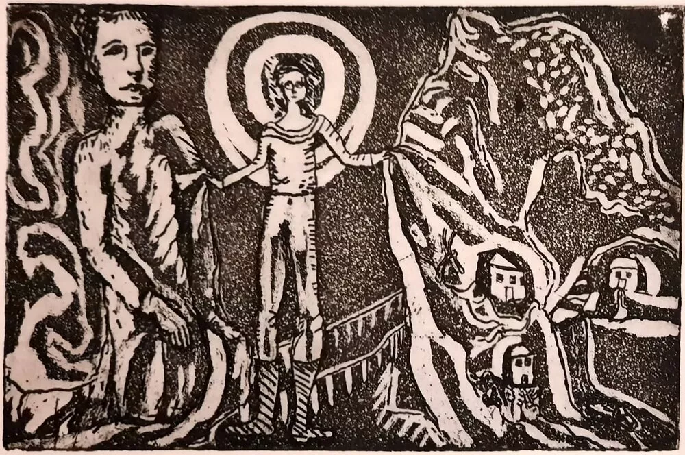 Gravure sur bois, projet collectif "Laval et l’ange" proposé par J.Michel Uyttersprot, juillet 2020