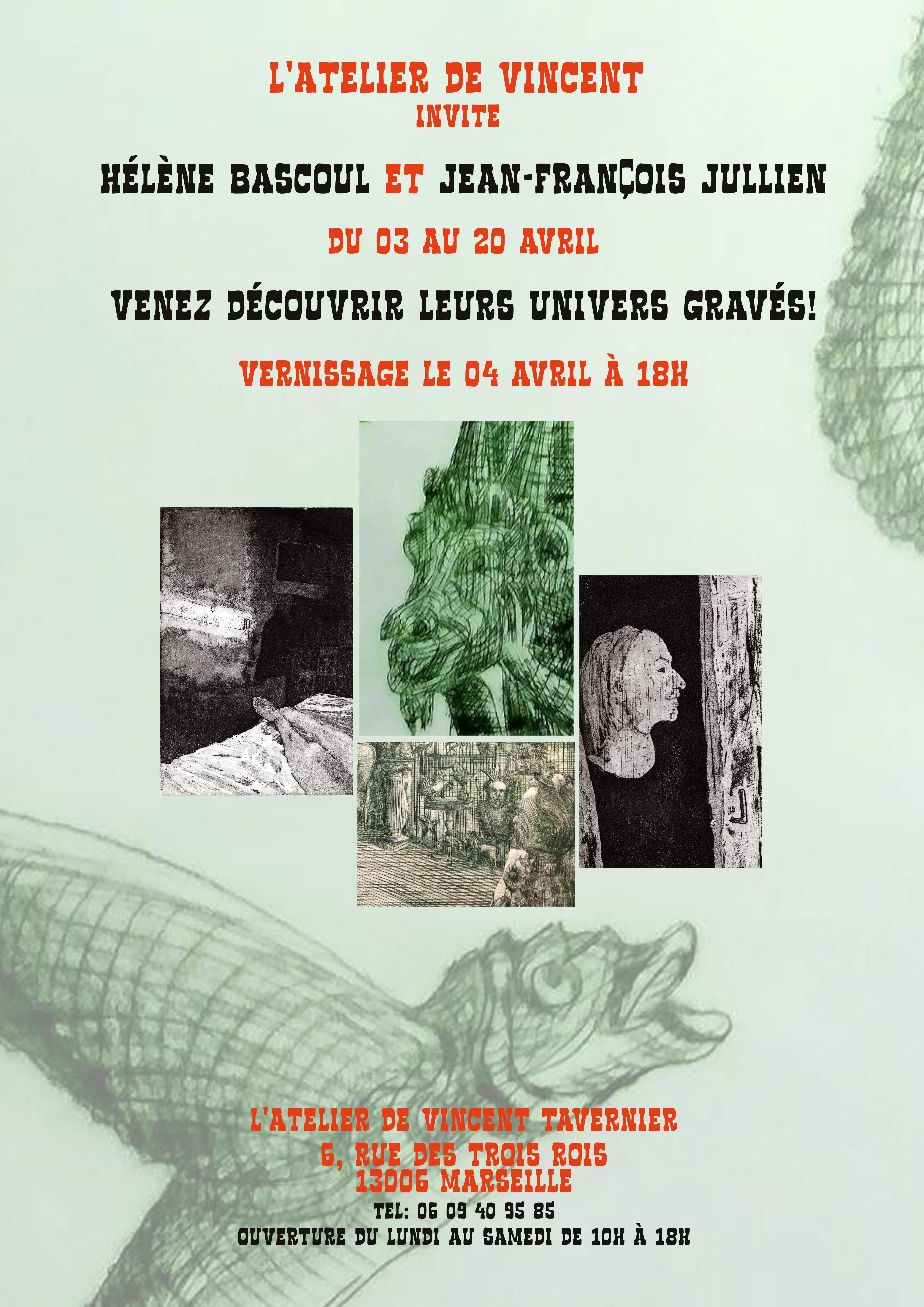 Exposition de gravures en taille douce à L’atelier de Vincent Tavernier aux côtés des gravures de Jean-François Jullien, Marseille, du 3 au 20 avril 2024